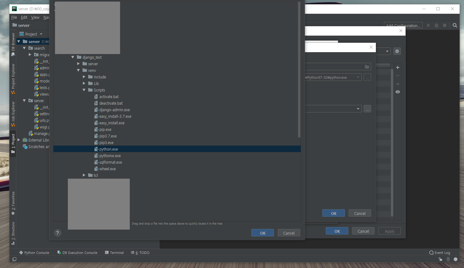 file - settings - project:server - project interpreter - 오른쪽에서 설정 아이콘 클릭 - show all - 플러스 아이콘 클릭 - 가상환경 경로 안에 있는 파이썬으로 선택