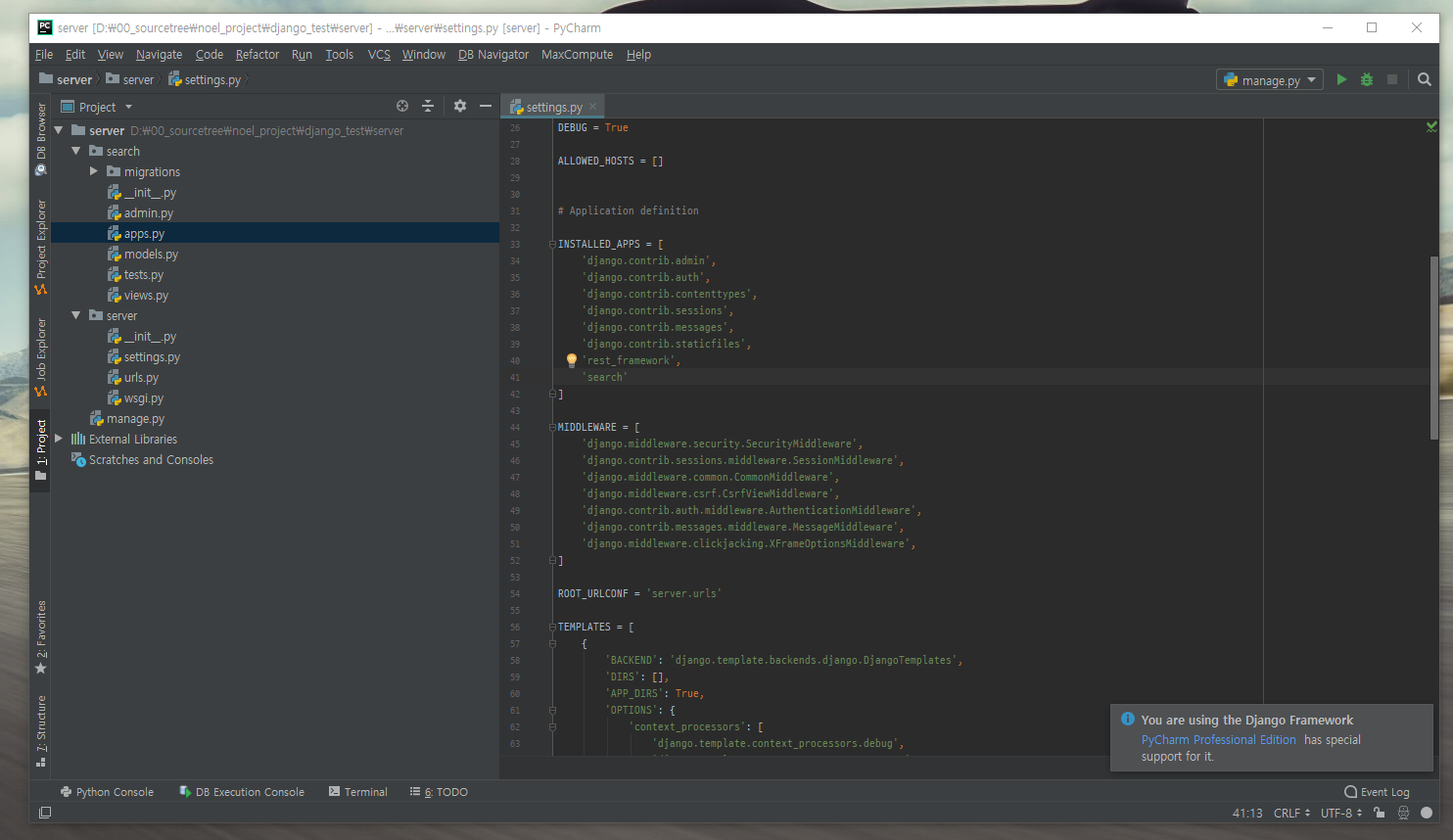프로젝트 내부의 settings.py 를 열어준다
