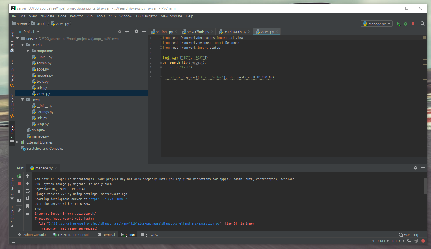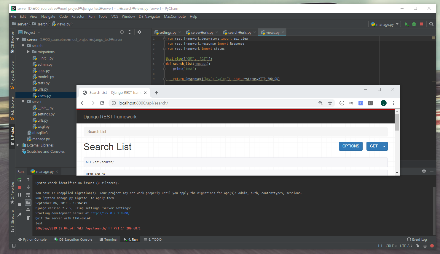 지금의 path 대로 따라가면 http://localhost:8000/api/search/ 로 접속하면 views의 search_list 메서드로 연결된다.