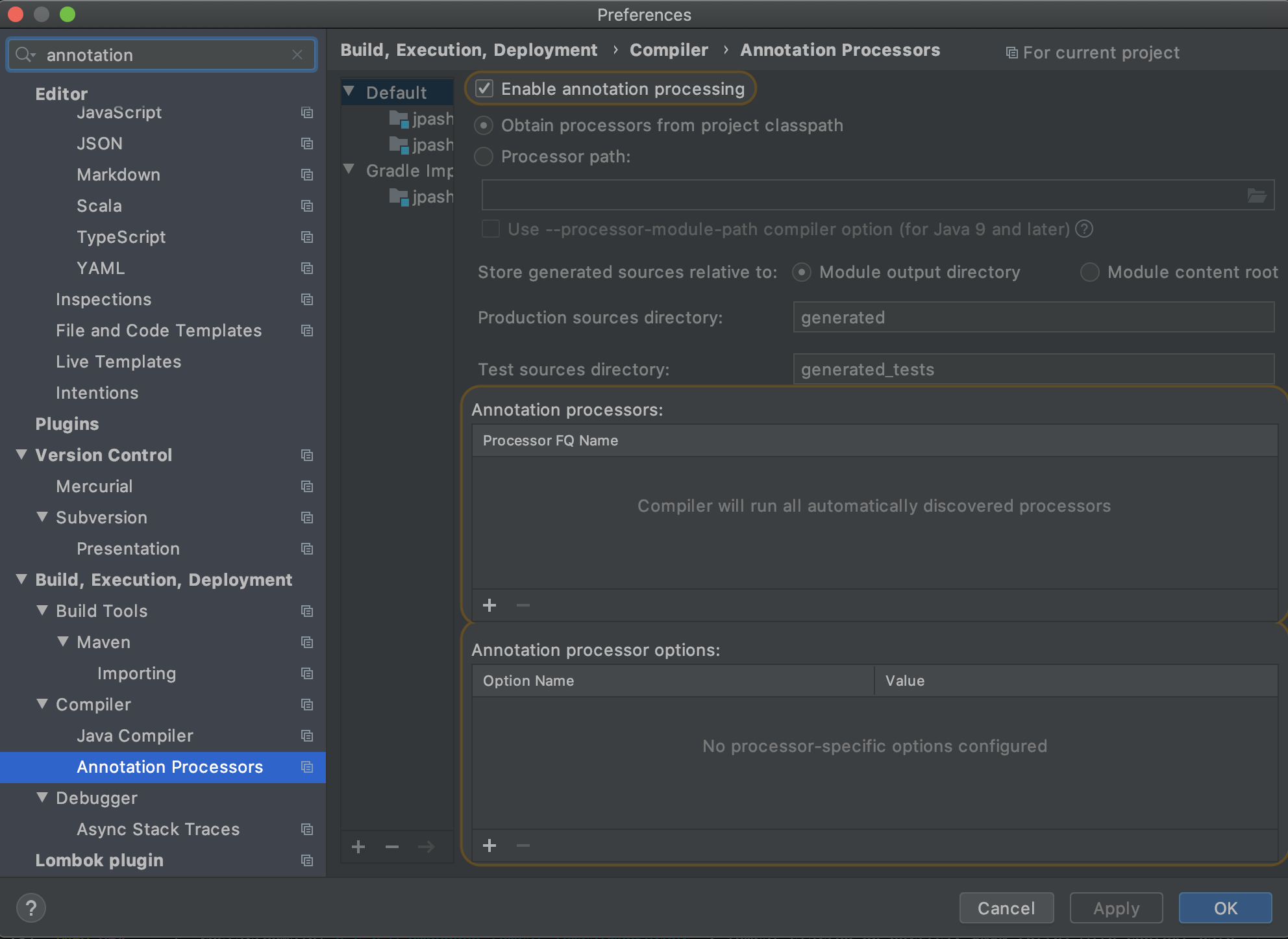 build.gradle에 추가 후에 설정에서 annotation processors에서 Enable annotaion processing 체크