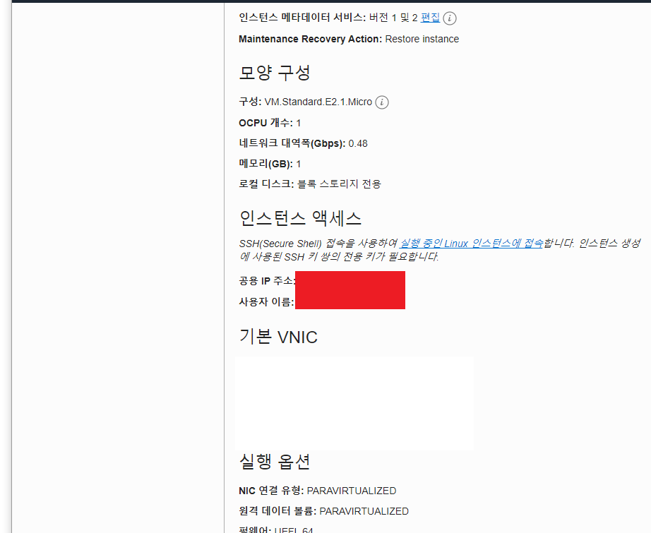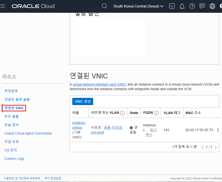 화면 아래로 쭉 내리고 연결된 VNIC 클릭한 후에 오른쪽의 instance 이름 클릭
